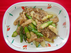 1)アスパラの根元の硬い部分を2cmほど切り落とし、ピーラーで皮をむき、サラダ油を熱し、ひき肉をほぐしながら、強火で炒め、塩で調味する。 2)アスパラも加えて2分ほど炒め、油揚げと Aを加える。 3)汁けがほぼなくなるまで炒め、水溶き、片栗粉を入れて混ぜたらできあがり!! |