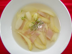 ホワイトアスパラ(生)…1束 ベーコン…100g パセリ…少々 <コンソメスープの作り方> 水…800cc スープの素…12g ●作り方