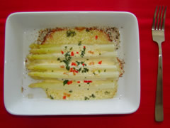 1)アスパラの根元の硬い部分を2cmほど切り落とし、ピーラーで皮をむき、塩を少々入れて水を沸騰させます。 2)沸騰してからアスパラを入れ、約3分茹でます。 3)Aを混ぜ合わせソースを作る。 4)グラタン皿にバターを薄くぬり、アスパラをのせソースをかける。 5)4)に粉チーズ、パセリとパプリアカのみじん切りをふりかけ、オーブントースターで焦げ目がつくまで(約5〜6分)焼いたらできあがり!! |